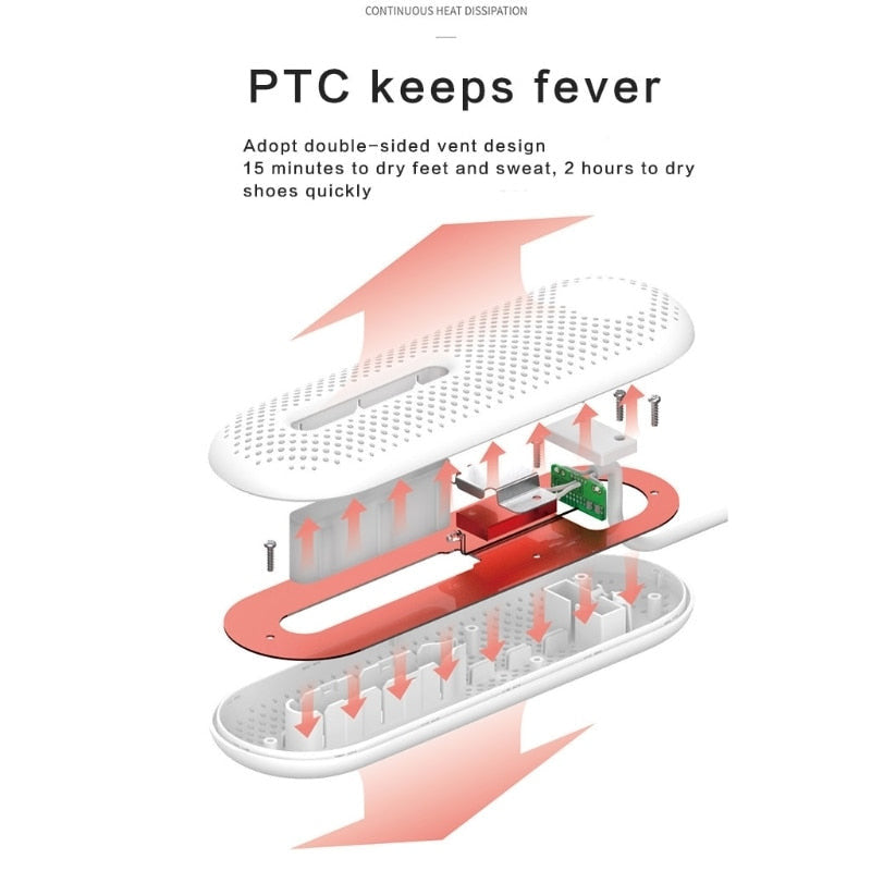 The portable shoe dryer adopts a ring design. suitable for shoes in sizes 28-45. Shoe dryers with heat blower There are two heating elements on both sides to increase the drying area, which can evenly dissipate heat, accelerate the evaporation of water, and quickly restore the dryness of the wet shoes, cleaning odors from inside shoes.